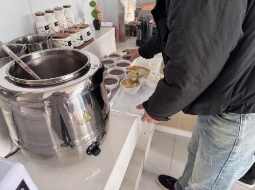 中午時(shí)分,食堂窗口前排起長(zhǎng)隊(duì)。紅棗、紅豆、花生米、蓮子、糯米等十余種食材經(jīng)過數(shù)小時(shí)熬煮,化作一碗碗熱氣騰騰的臘八粥迎接員工的到來。廚師們將臘八粥盛到每位員工碗中,員工們接過粥碗,笑容洋溢。